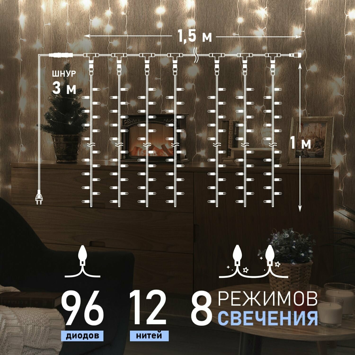 Гирлянда "Светодиодный Дождь" с 8 режимами свечения 1,5х1 м, 96 LED, цвет свечения: Теплый белый