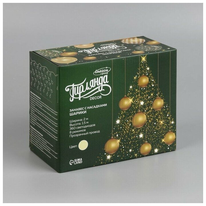 Гирлянда «Занавес» 2 х 1.5 м с насадками «Шарики», IP20, прозрачная нить, 360 LED, свечение тёплое белое, 8 режимов, 220 В