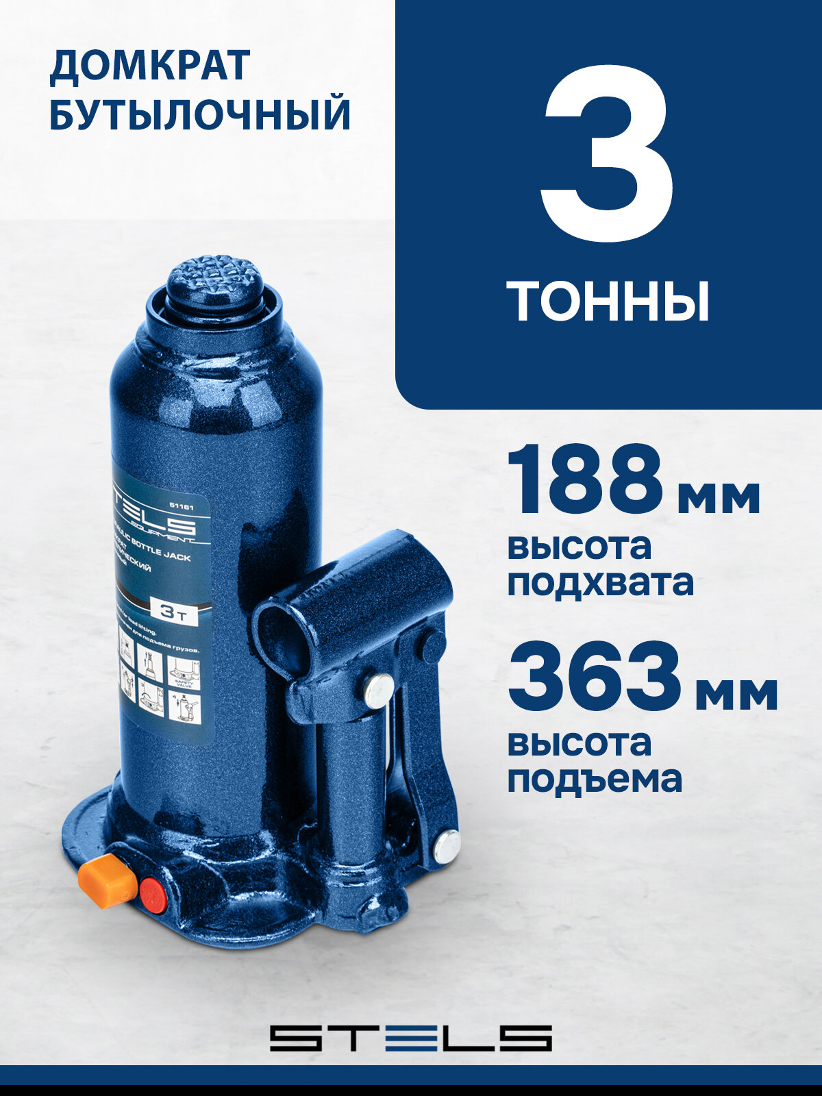 Домкрат гидравлический бутылочный, 3 т, h подъема 188-363 мм Stels, арт. 51161