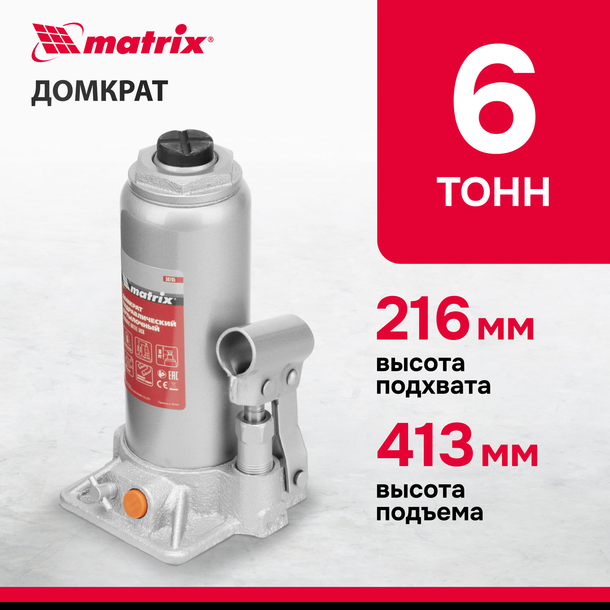MATRIX Домкрат гидравлический MATRIX 50765, бутылочный, 6 т, высота подъема 216-413 мм 4 321 ₽