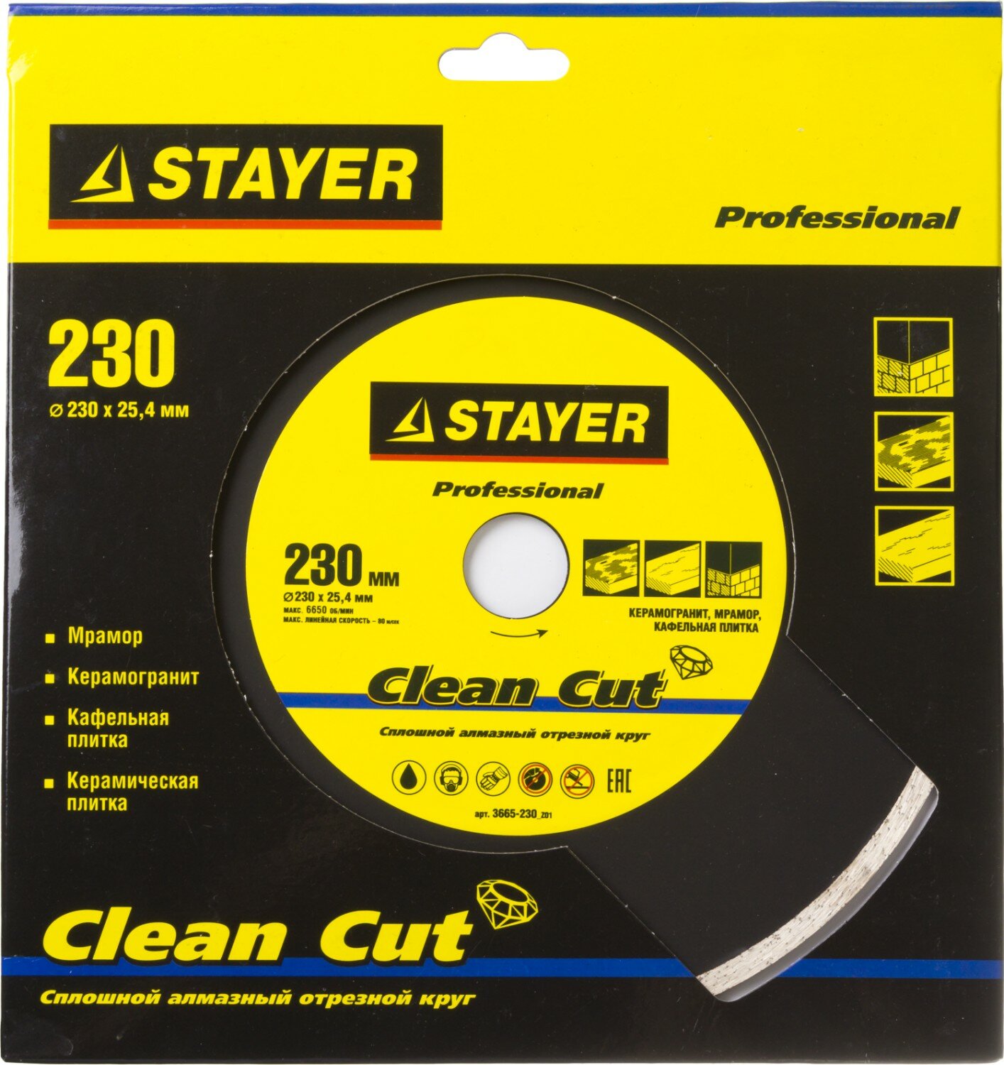 STAYER Clean Cut, 230 мм, (25.4 мм, 5 х 2.4 мм), сплошной алмазный диск, Professional (3665-230)
