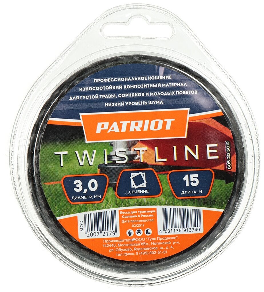 Леска для триммера 3 мм, 15 м, квадрат, Patriot, ProfLine/Twistline, скрученный, острые грани, черная