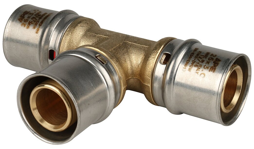 Тройник равнопроходный 26х26х26 для металлопластиковых труб прессовой ФУМ лента 10м
