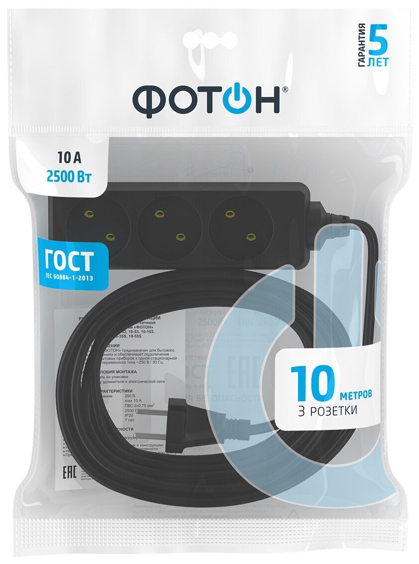 Фотон Удлинитель сетевой 10-103, 10м, 3 розетки, 10А, Черный 22721 информация: