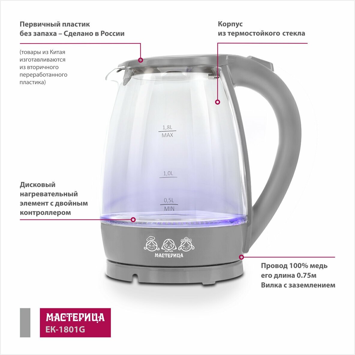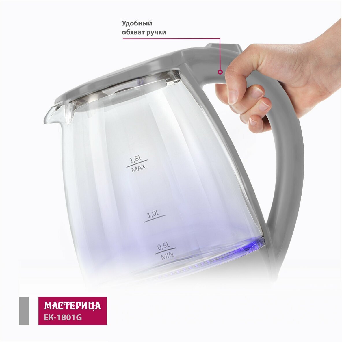 Чайник Мастерица ЕК-1801G, дымчатый, 1,8л, стекло, 1850 Вт информация: