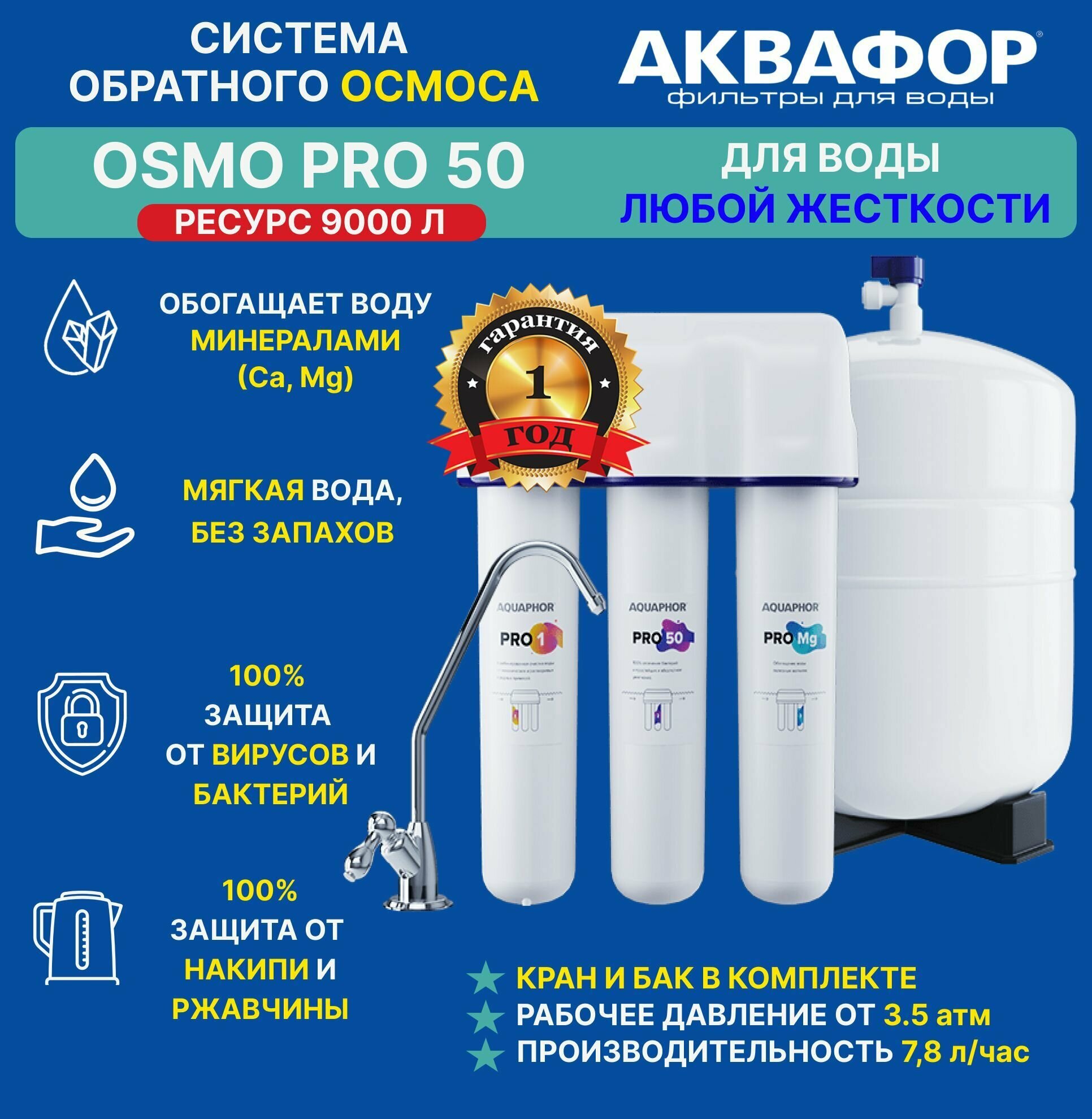 Система обратного осмоса Аквафор OSMO Pro 50 с внешним баком под мойку (до 7,8 л/час) информация: