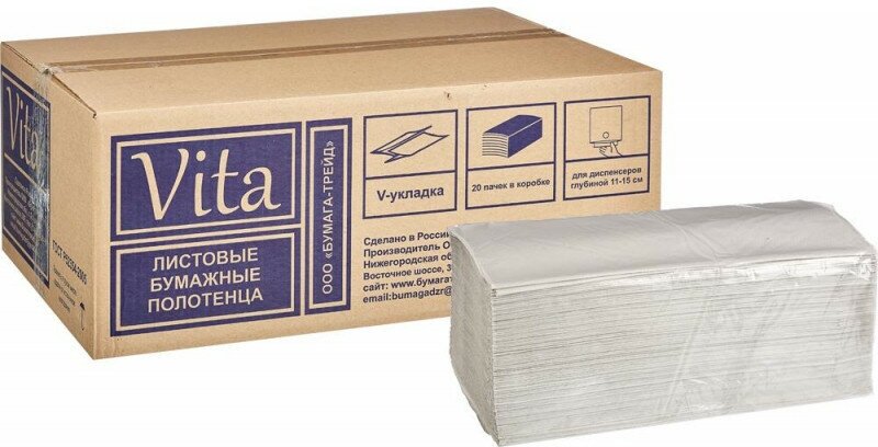 Полотенце гигиеническое бумажные VITA, V сложения, 23х23сантиметра, цвет серый, 1слойные, 5000 листов, 20 упаковок в коробке. (артикул производителя NV-250N1)