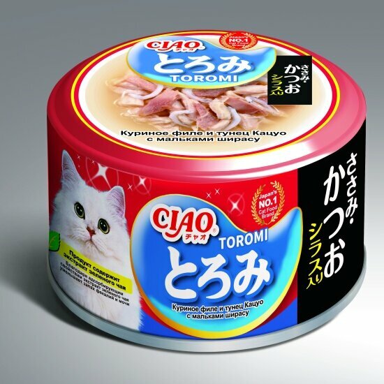 Корм для кошек Inaba Ciao Toromi куриное филе с тунцом кацуо и мальками ширасу 80г информация: