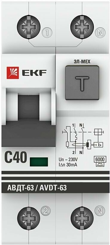 Дифференциальный автомат EKF АВДТ-63 2П 30 мА C 6 кА A электромеханический 40 А