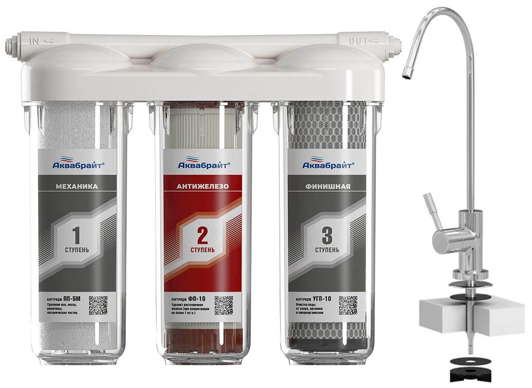 Трехступенчатая система очистки воды под мойку с отдельным краном. Аквабрайт абф-триа Антижелезо информация:
