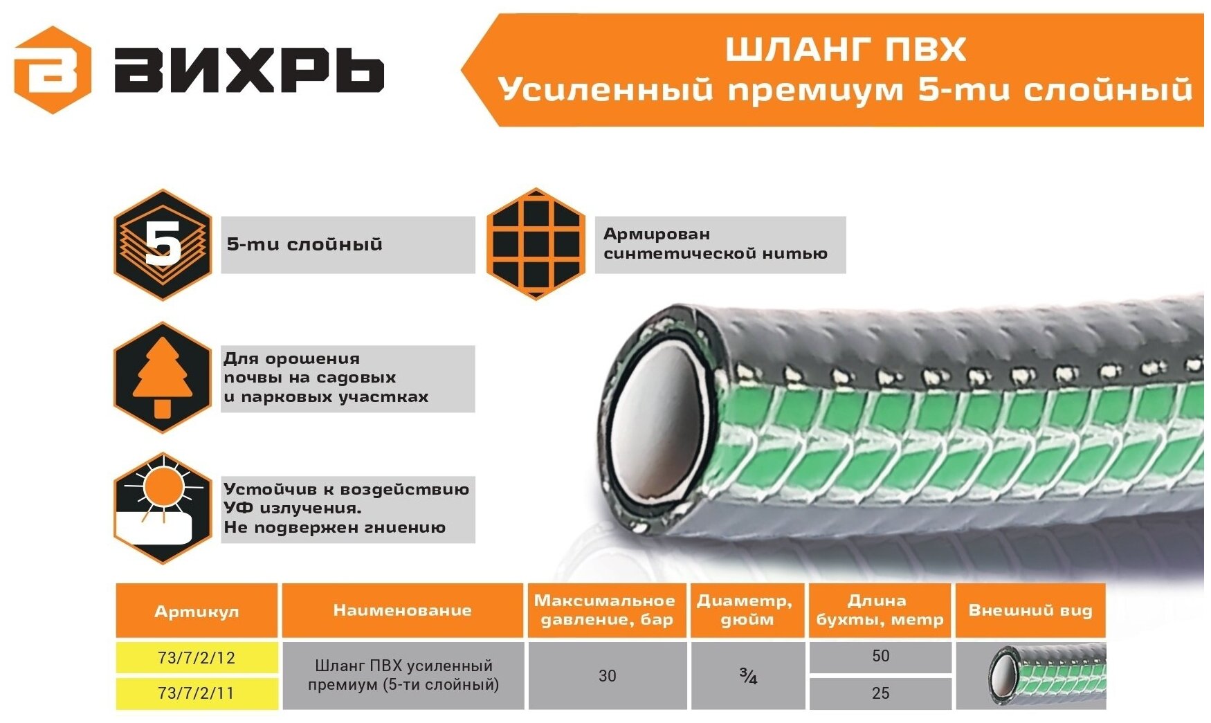 Шланг поливочный ПВХ пищевой 5-слойный Премиум армированный 3/4", 25м (до 30 бар) Вихрь информация: