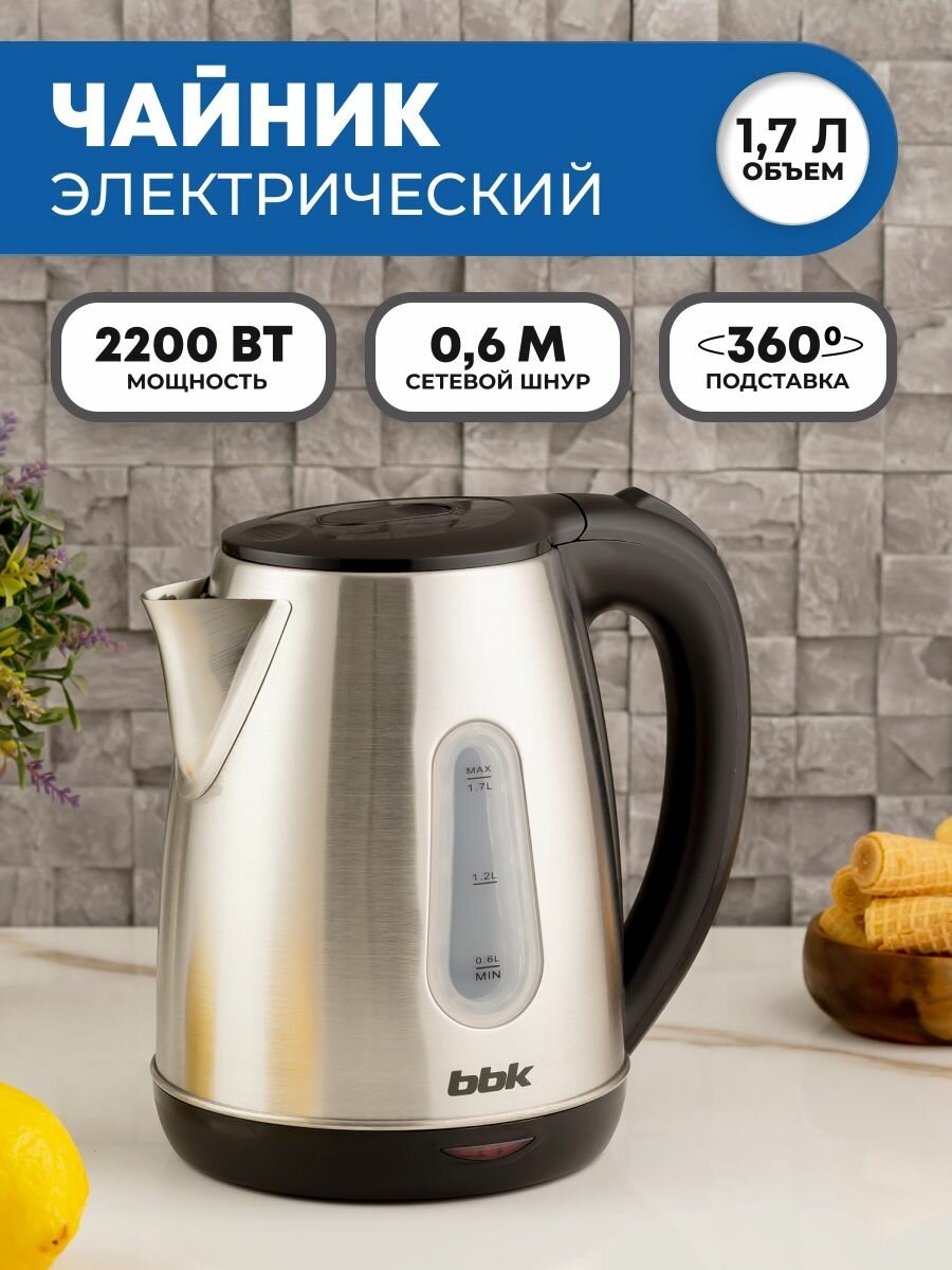 Чайник электрический BBK EK1761S нержавеющая сталь/черный, объем 1.7 л, мощность 2200 Вт