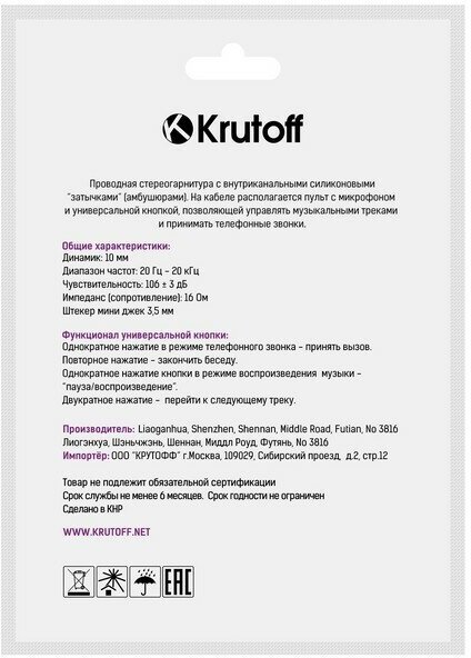 10 цен на Наушники Krutoff HF-J69 вакуумные микрофон 106 дБ 16 Ом 3.5 мм 1 м белые