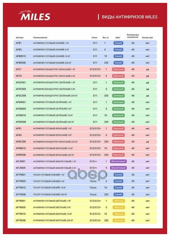 Мы выбрали 10 лучших цен на Антифриз MILES AFLR001. Перед тем как купить Антифриз MILES AFLR001 посмотрите найденные предложения из Яндекс Маркета и других сайтов на основе XML фидов.