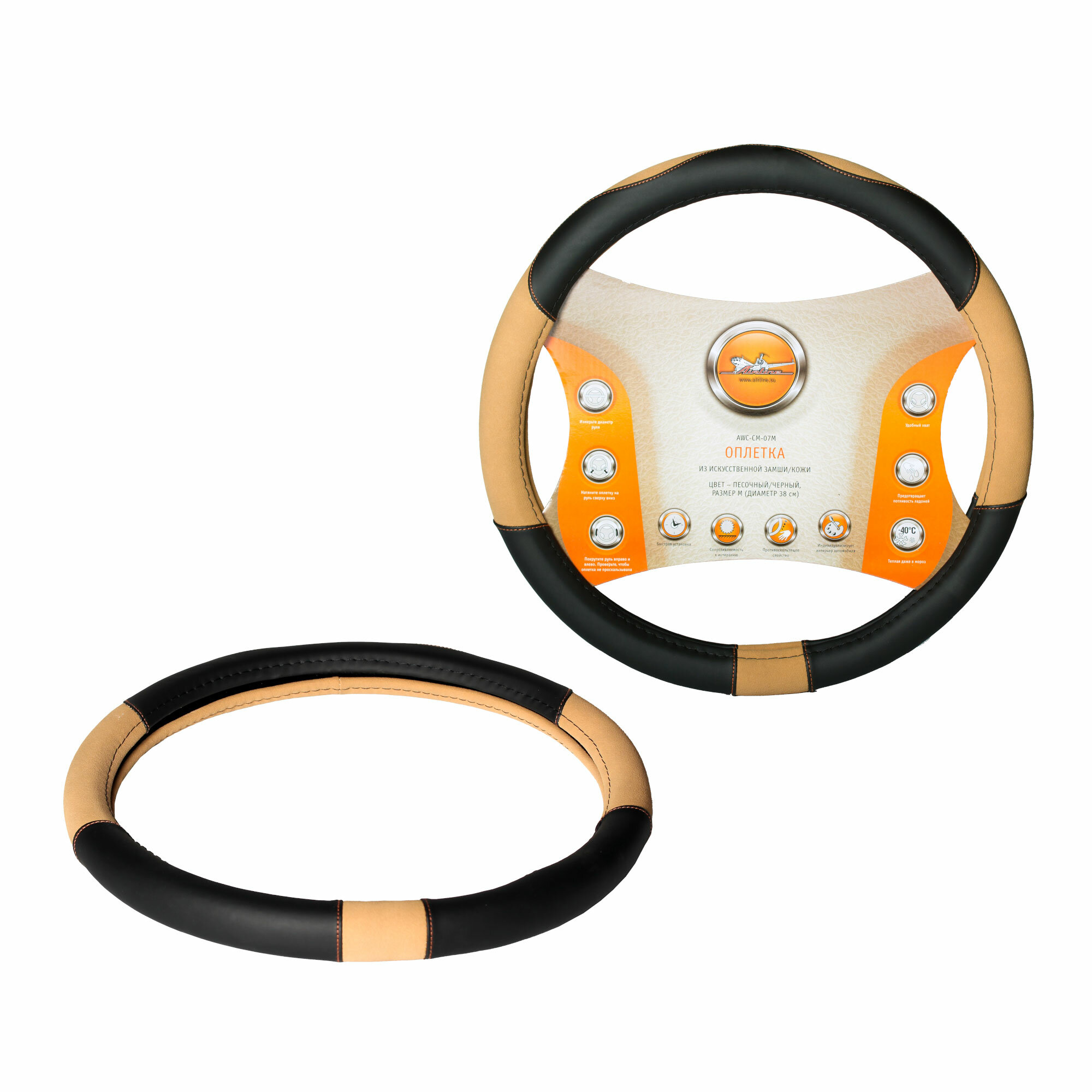 AIRLINE AWC-CM-07M Оплетка на руль, искусственная замша/кожа, песочная/черная, 38 см / M