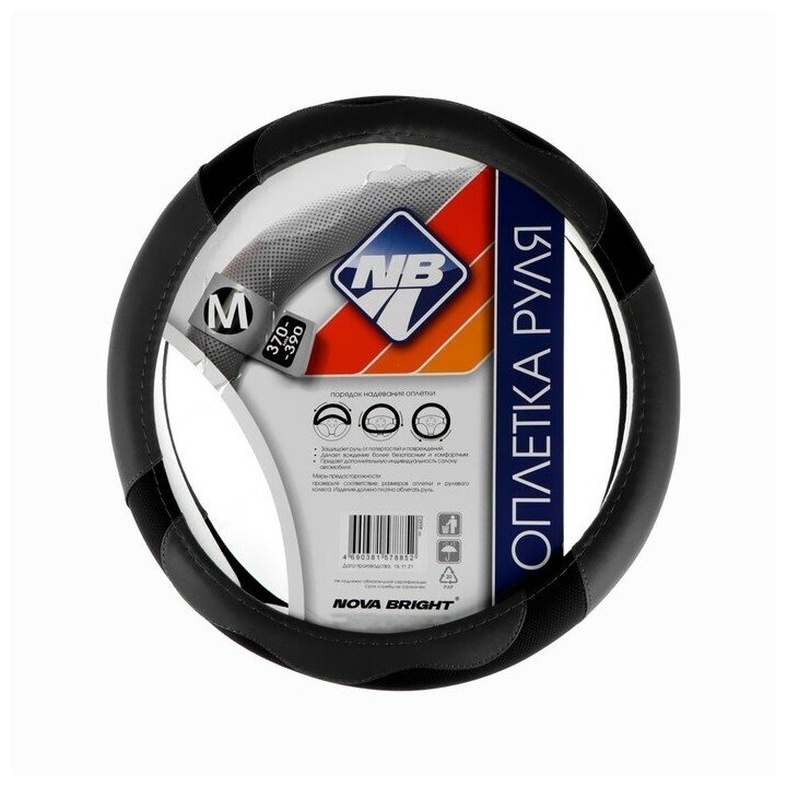 Оплетка на руль Nova Bright экокожа, черная, ребристая, перфорация, размер М
