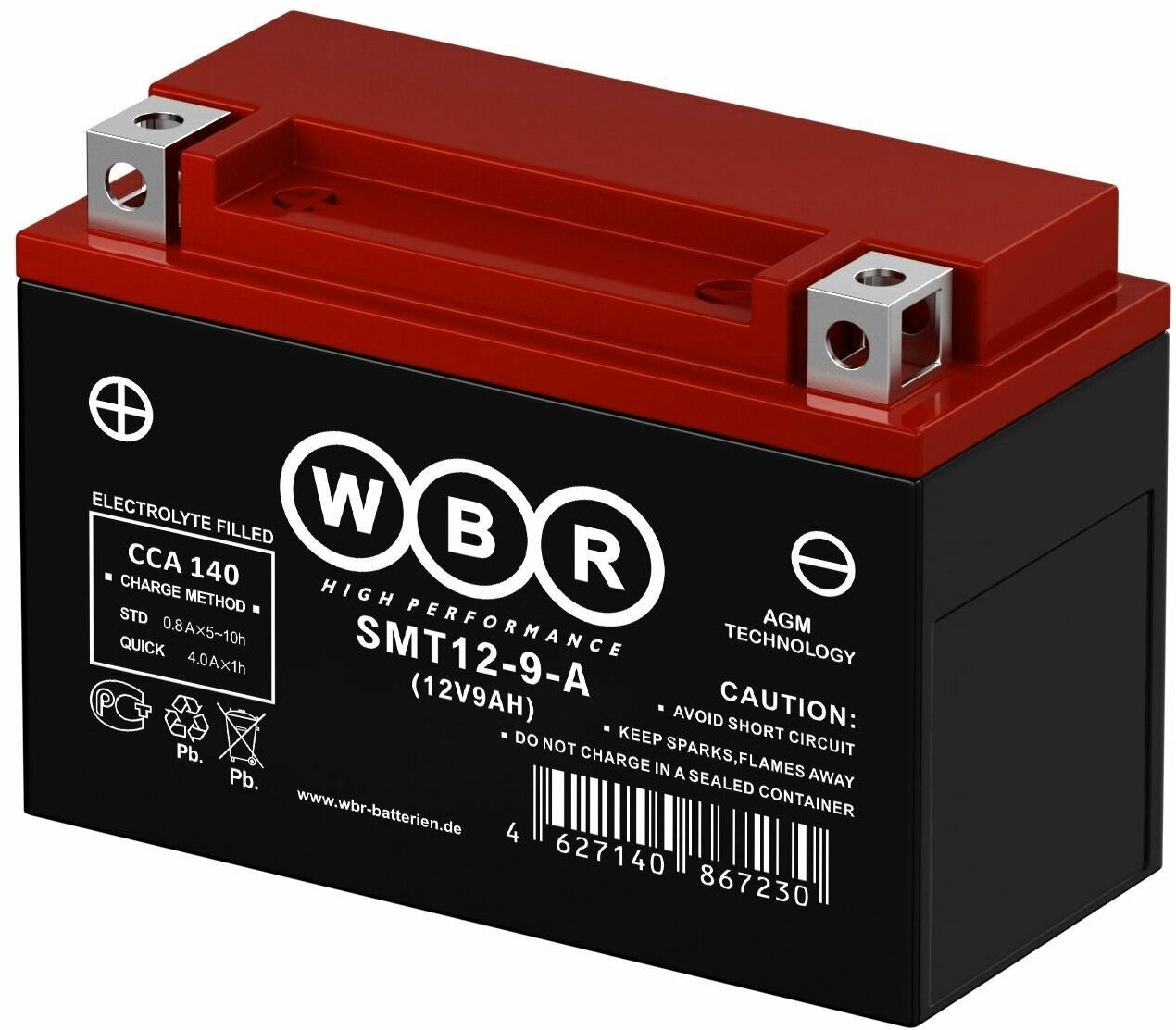 Мото аккумулятор стартерный WBR SMT12-9-A 12В 9Ач (12V 9Ah) YT9B-BS 120A, AGM для мотоцикла, мопеда, скутера, гидроцикла, квадроцикла, снегохода информация: