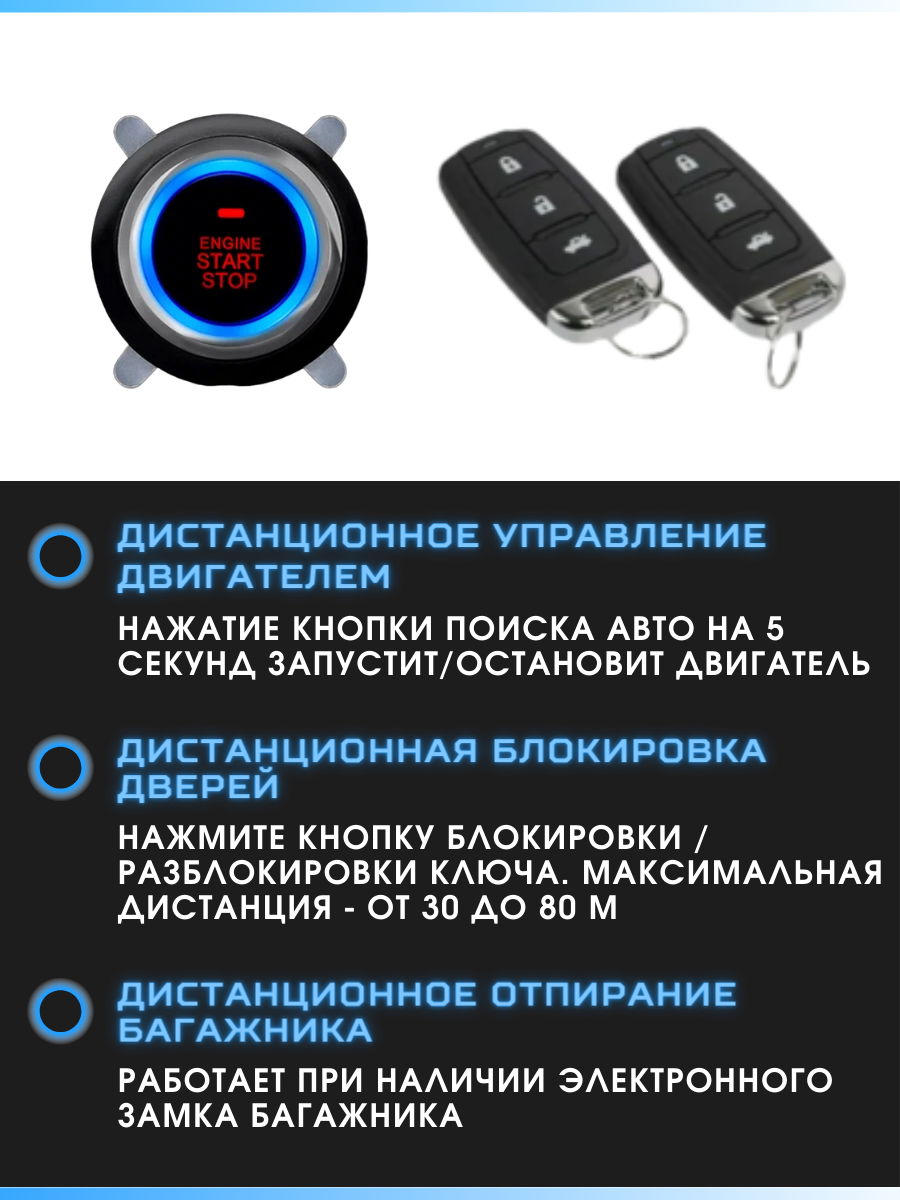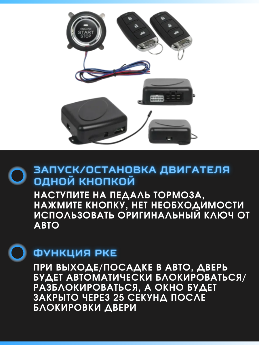 | Подробная комплектация | кнопка запуска двигателя, 2 брелка, все необходимые для подключения провода и крепления |