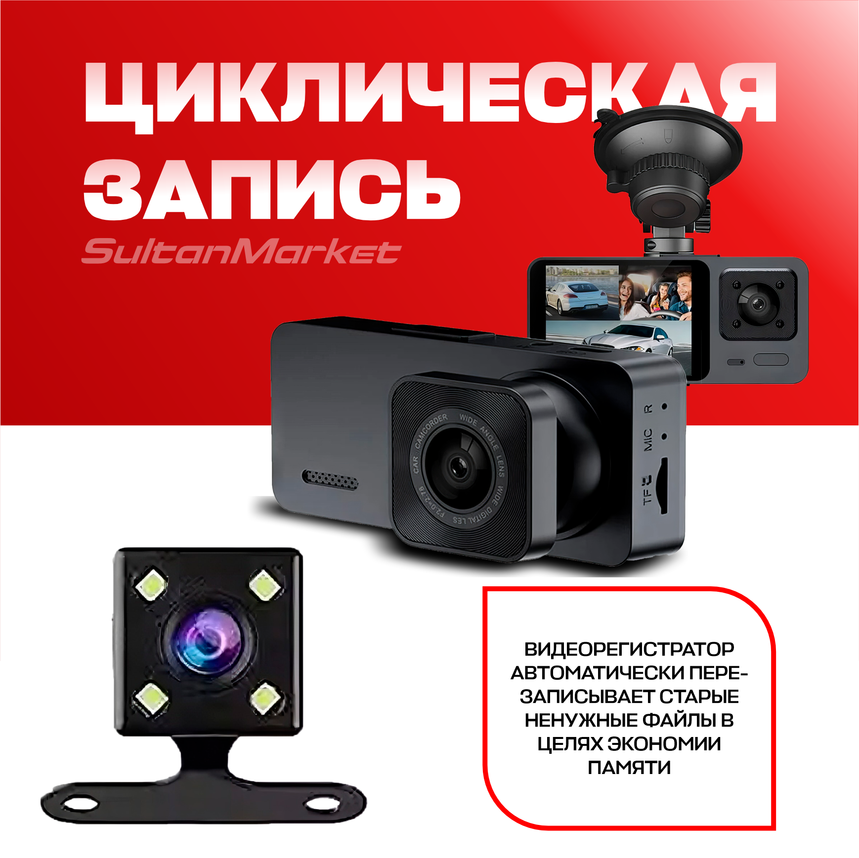 Автомобильный видеорегистратор, с камерой заднего вида, 2 камеры, 1920x1080