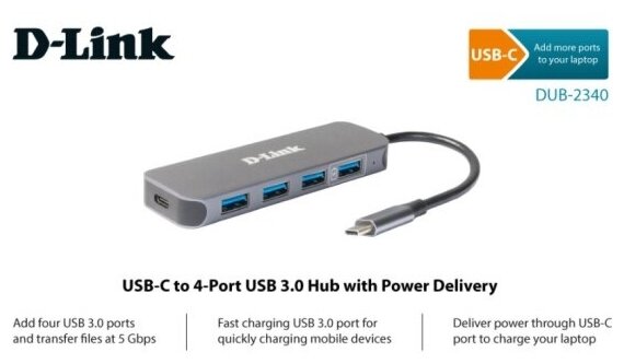 D-Link DUB-2340/A1A Концентратор с 4 портами USB 3.0 (1 порт с поддержкой режима быстрой зарядки), 1 портом USB Type-C/PD 3.0 и разъемом USB