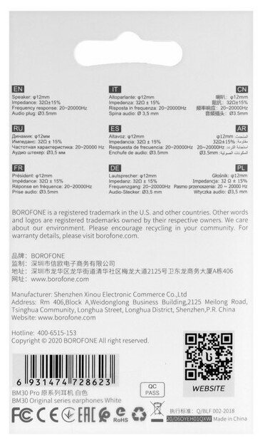 Гарнитура внутриканальная Borofone BM30 Pro Original series, белый