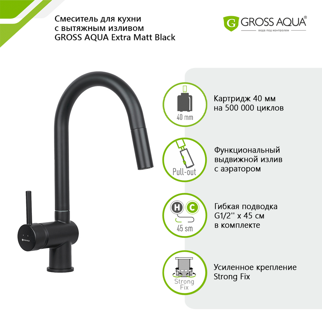 Смеситель для кухни с выдвижным изливом и лейкой Gross Aqua Extra, латунь, черный матовый, 3140609MB. информация: