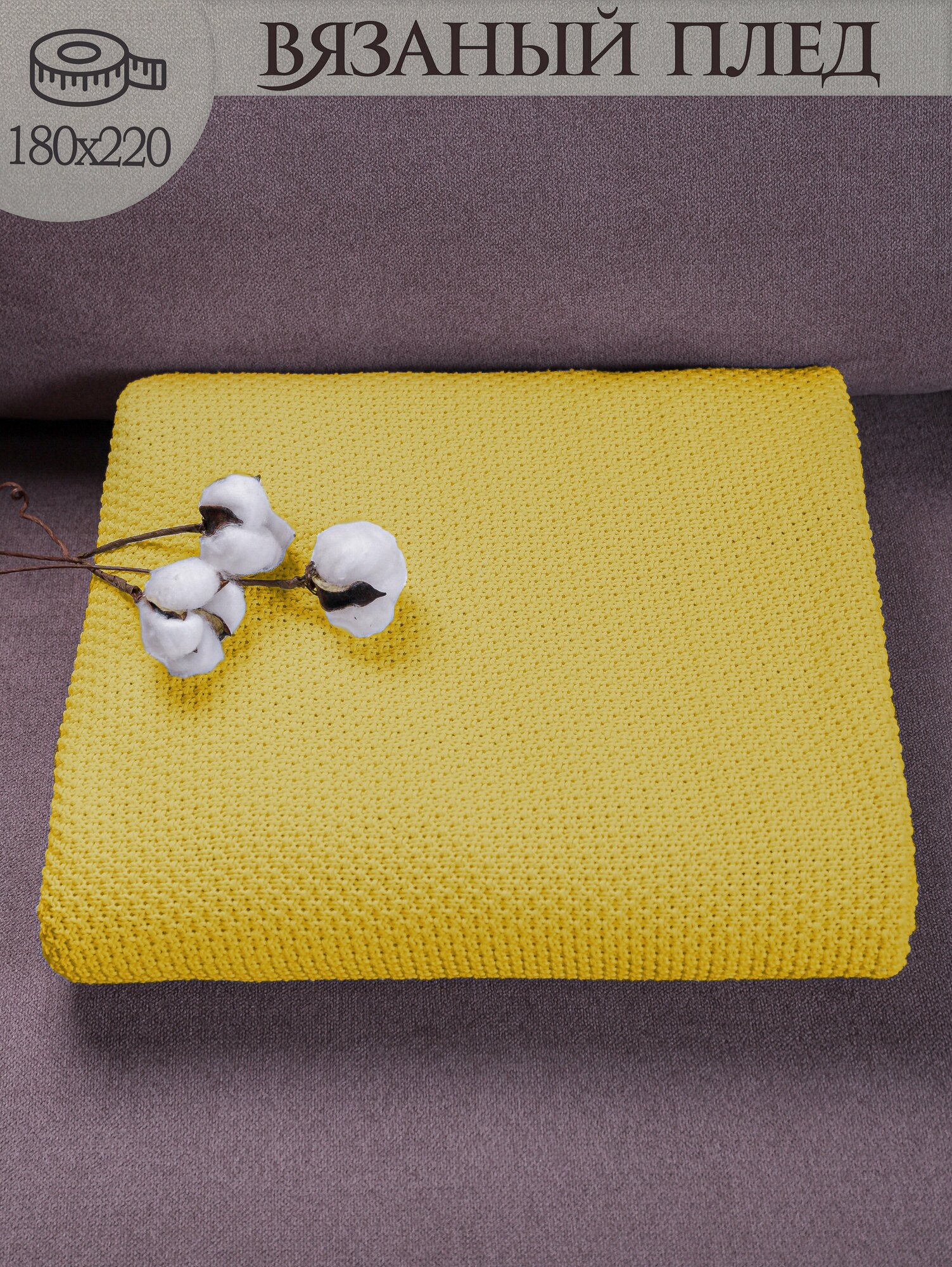 Плед вязаный, Warm Whiff, желтый, 180х220, хлопок, покрывало для взрослого, дачи, спальни, кровати, однотонное одеяло, в подарок, мягкий