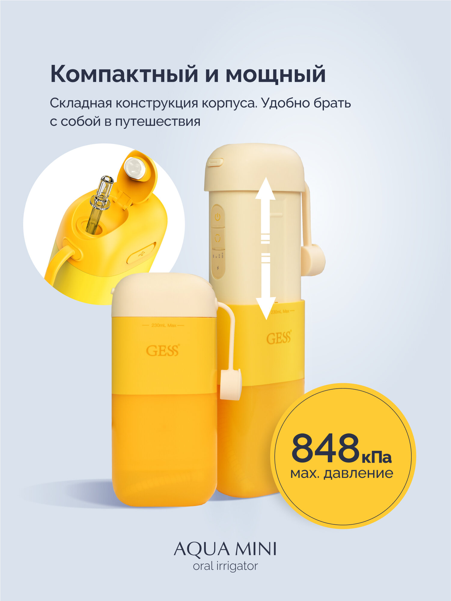 Отзывы на Ирригатор для полости рта портативный GESS Aqua Mini беспроводной медицинский ирригатор, 3 насадки, ёмкость 230 мл, 138-848 кПа, оранжевый