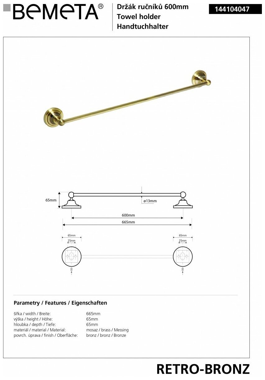 Горизонтальный полотенцедержатель Bemeta Retro 66,5см, арт. 144104047, бронза