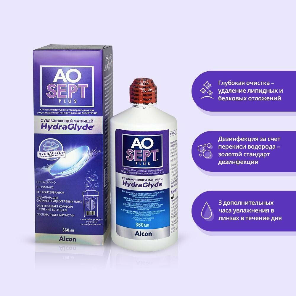 Отзывы на Пероксидный раствор, система для контактных линз Alcon AOSEPT Plus HydraGlyde (Аосепт) (360 мл) + контейнер