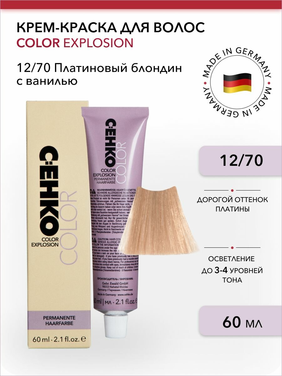 Профессиональная краска для волос 12/70 Платиновый блондин с ванилью, осветлитель, для блонда, холодный, стойкая, перманентная, 60 мл, C:EHKO COLOR EXPLOSION