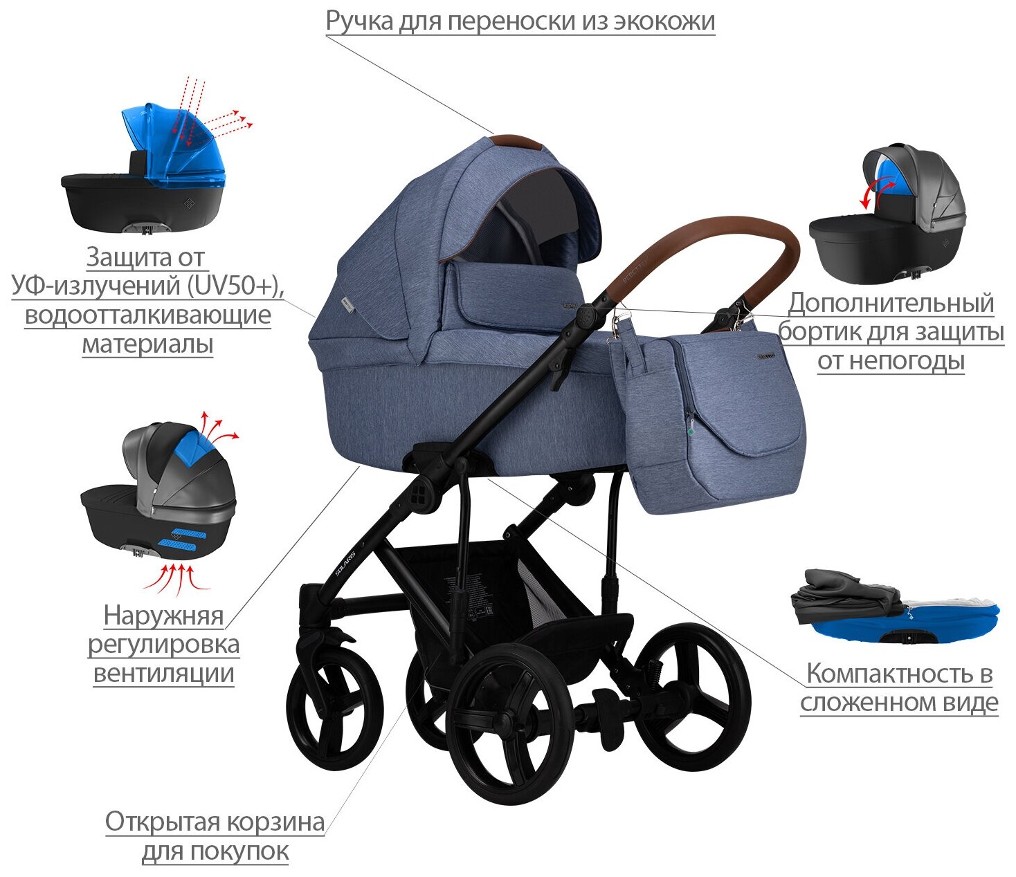 | Особенности шасси | корзина для покупок / перестановка блока лицом/спиной / регулировка высоты ручки / съемные колеса |
