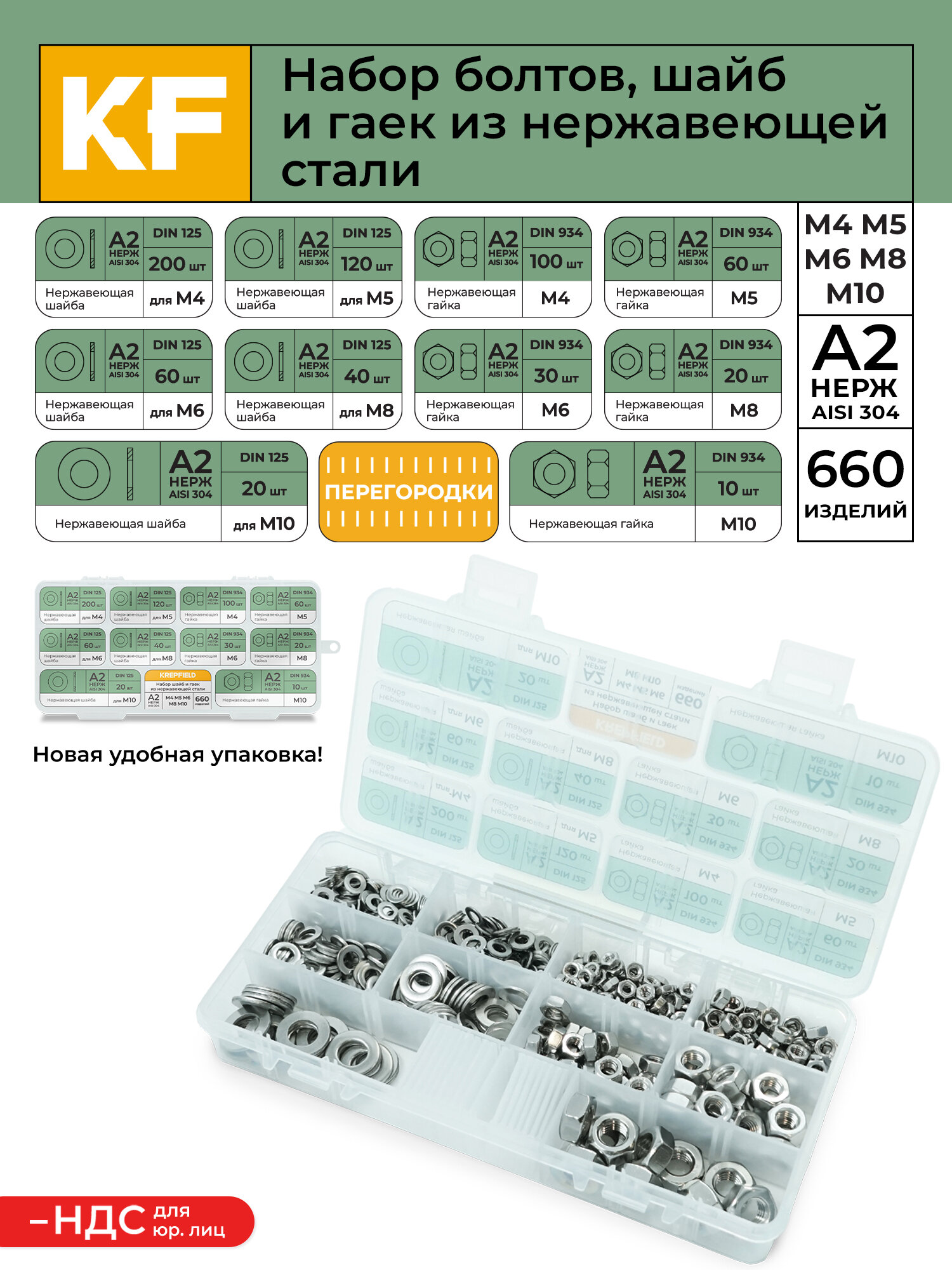 Набор шайб и гаек из нержавеющей стали М4, М5, М6, М8, М10 660 предметов в кейсе информация: