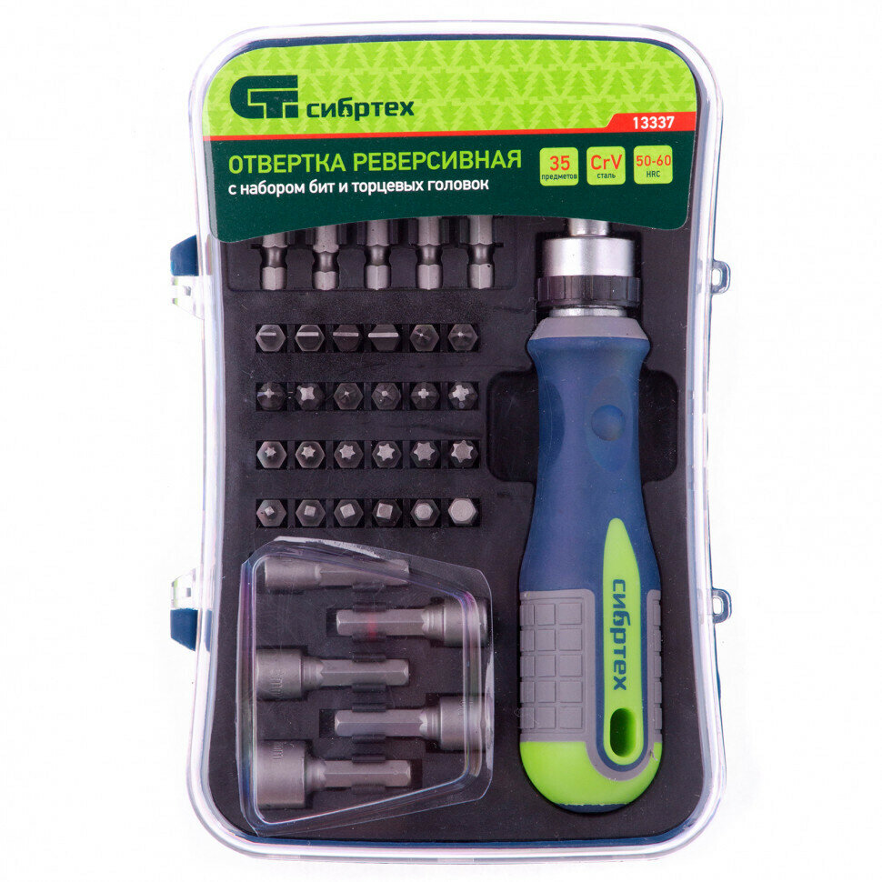 Отвертка реверсивная с набором бит и торцевыми головками Сибртех 35 шт, CrV 13337 информация: