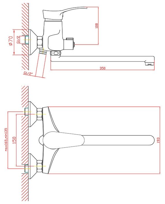 Смеситель на раковину настенный Эверест B46-350 с круглым поворотным изливом, кран-буксы 1/2", хром