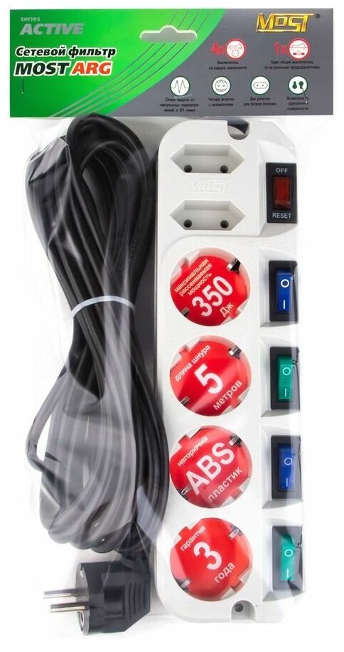 Отзывы на Сетевой фильтр MOST Active ARG, 6 розеток, с/з, 10А / 2200 Вт белый 5 м 250 мм 75 мм 60 мм 6