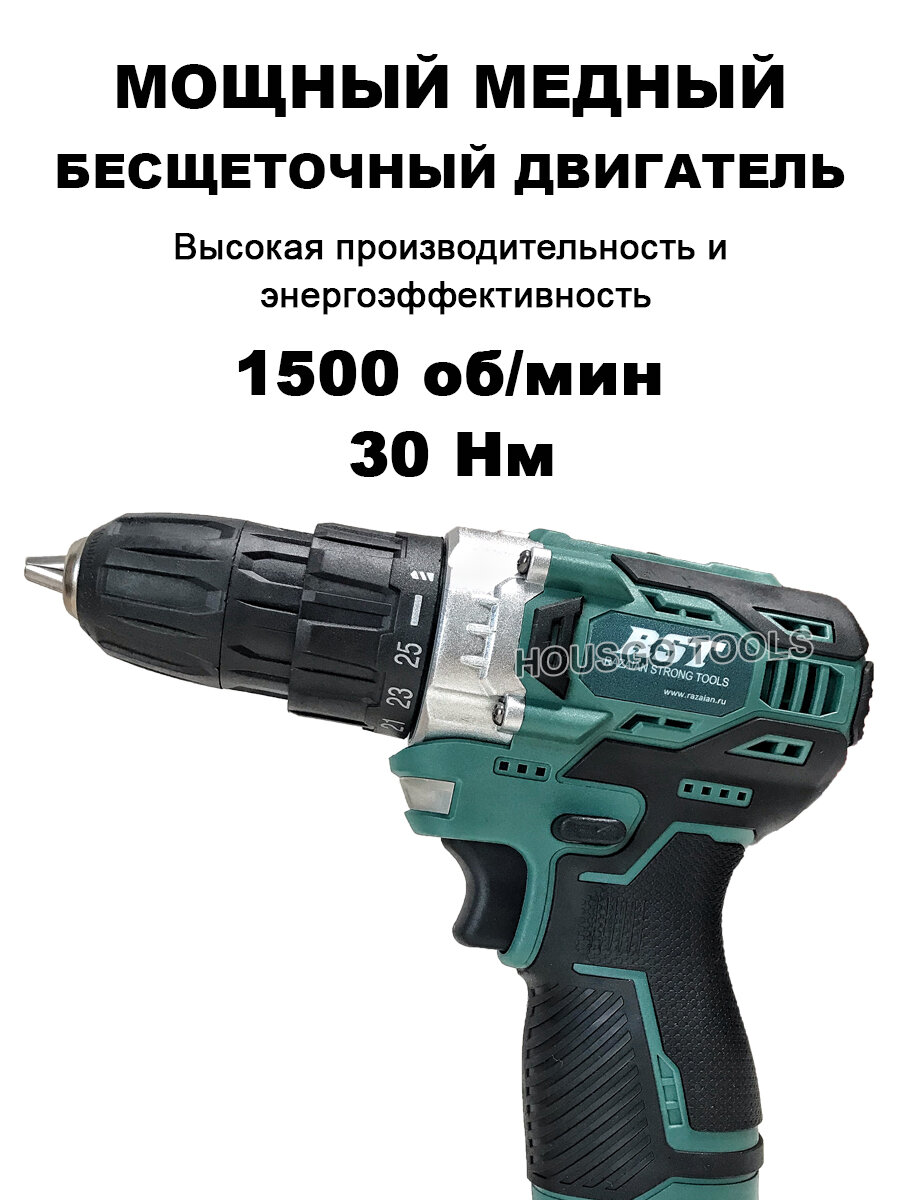 Дрель шуруповерт аккумуляторный бесщеточный 12В в кейс, 1500 об/мин, 2 АКБ Li-ion 2 Ач, 30 Нм, 2 скорости, фонарик, реверс, з/у информация: