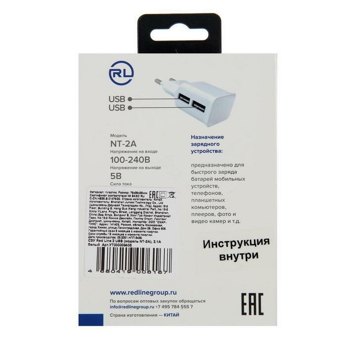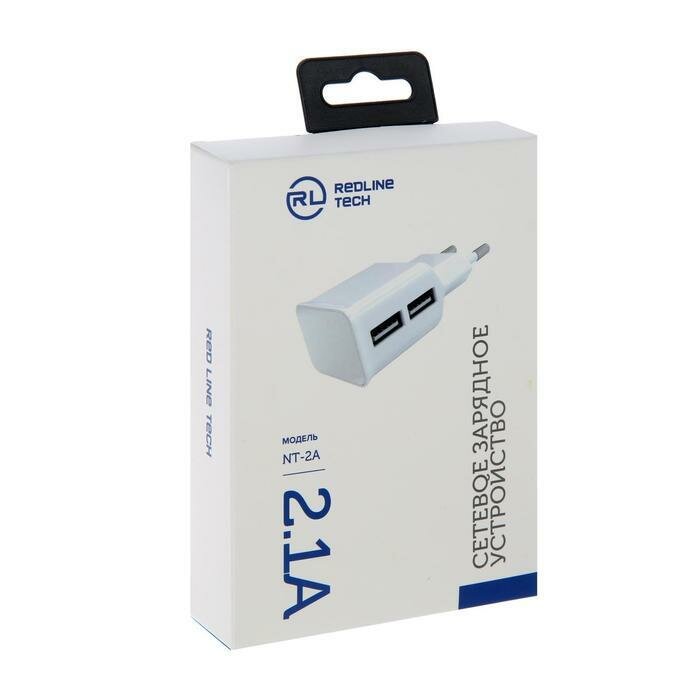 Зарядное устройство Red Line NT-2A, сетевое, 2 USB, 2.1 А, белое информация: