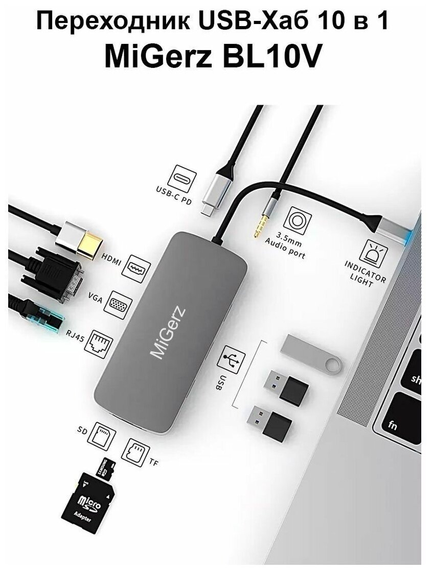 Переходник разветвитель хаб hub USB Type-C 10 в 1 MiGerz информация: