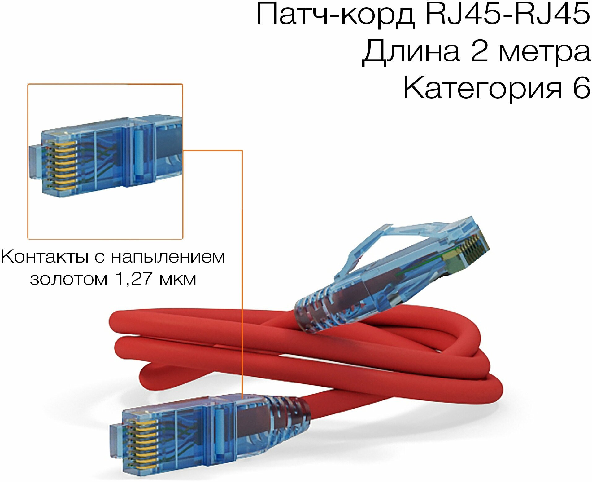 Кабель Hyperline Патч-корд U/UTP, Cat.6 (100% Fluke Component Tested), LSZH, 2 м, красный информация:
