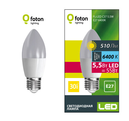 Светодиодная лампа FOTON LIGHTING FL-LED C37 5.5W E27 6400К 220V 510Лм 37*100мм информация: