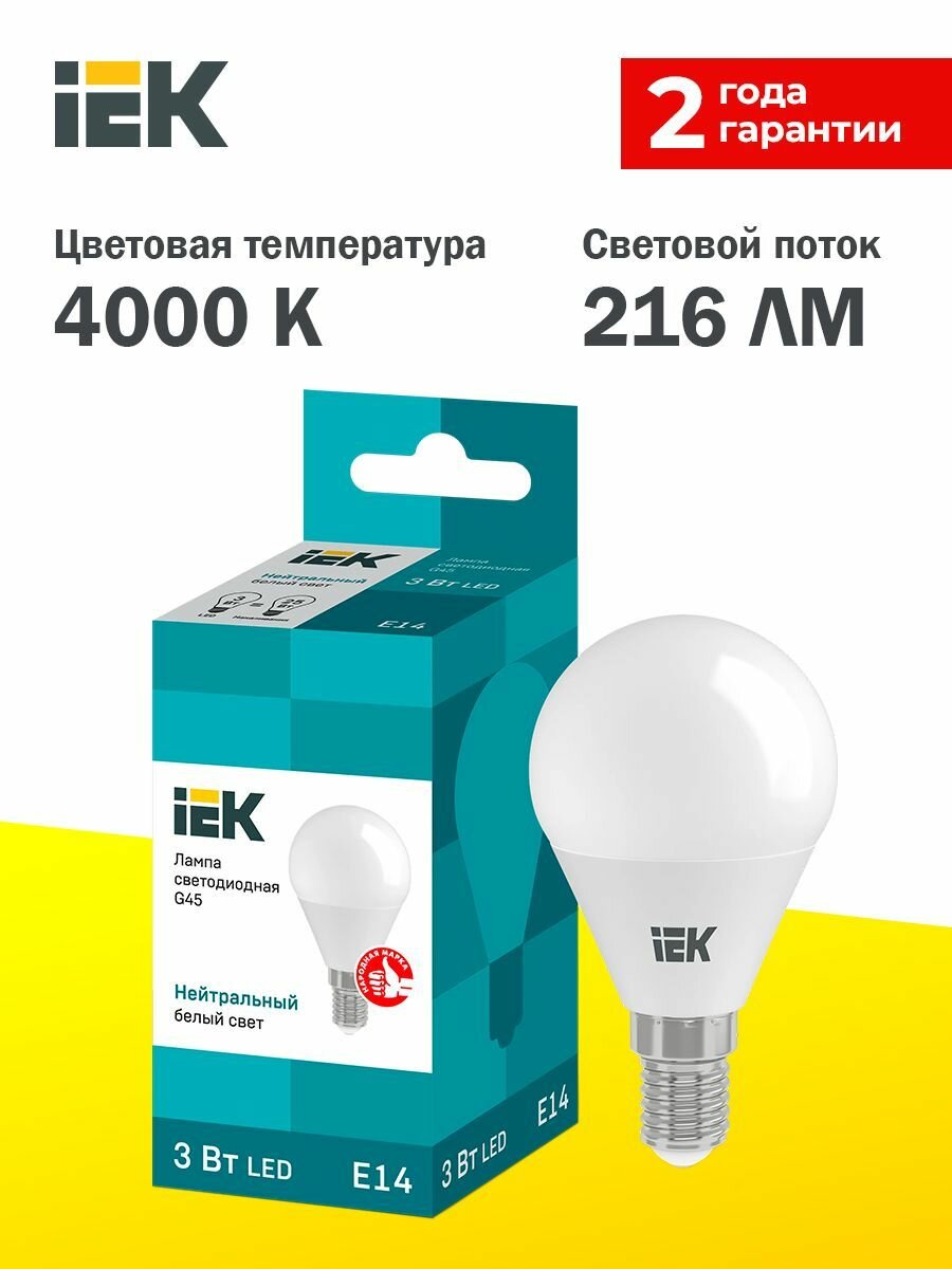 Лампа светодиодная ECO G45 шар 3Вт 230В 4000К E14, IEK LLE-G45-3-230-40-E14 (10 шт.)