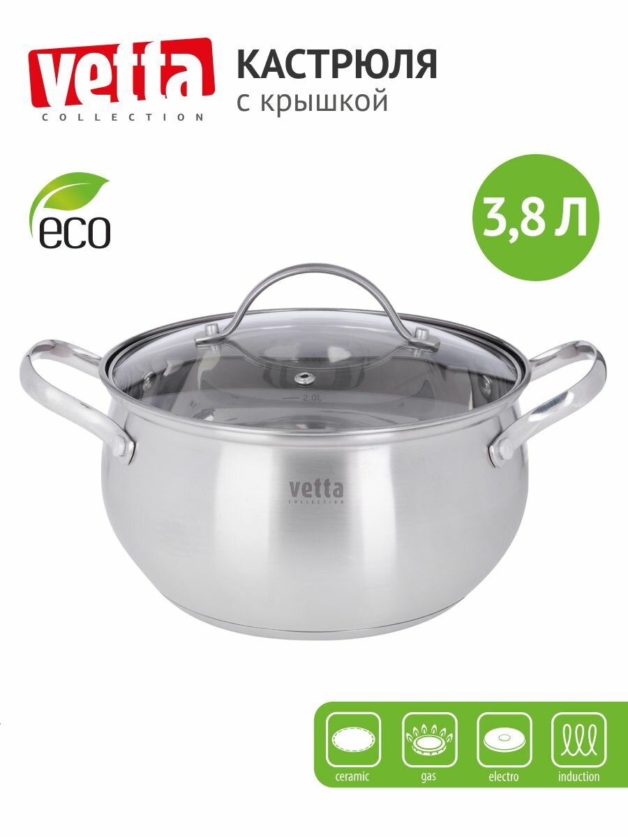 Кастрюля нерж сталь 3,8л Vetta Женева 20х11,5см стекл крышка ,индукция