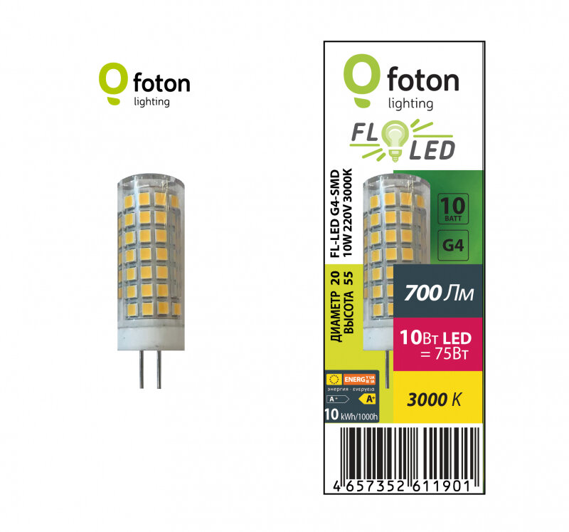 Светодиодная лампа FOTON LIGHTING FL-LED G4-SMD10W 220V 3000К G4 700lm 20*71mm информация: