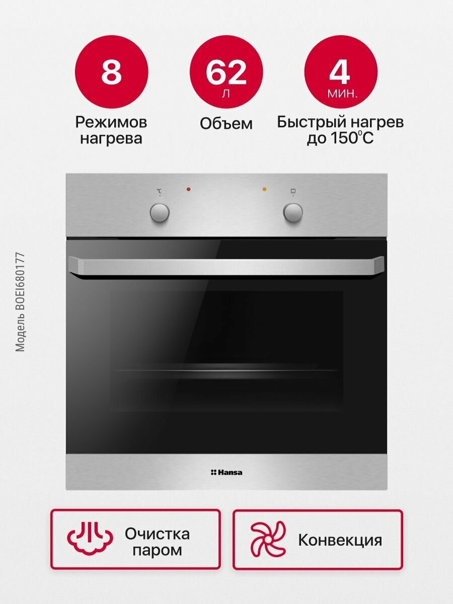 Электрический духовой шкаф Hansa встраиваемый BOEI680177, 60 см, с грилем и конвекцией, 8 режимов, быстрый предварительный нагрев, с очисткой паром, двойное жаропрочное стекло