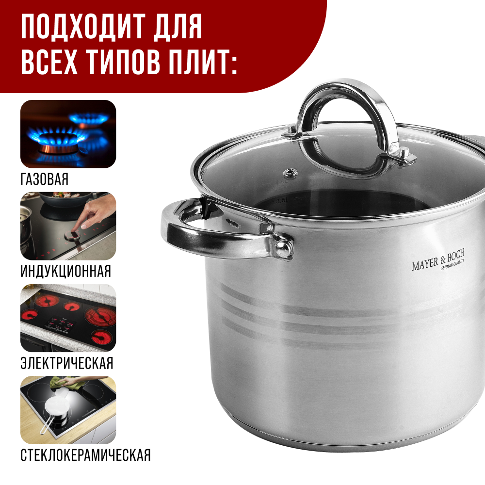 Кастрюля нержавеющая сталь Mayer&Boch со стеклянной крышкой , 8,6 л, для всех видов плит, в т.ч. для индукционных