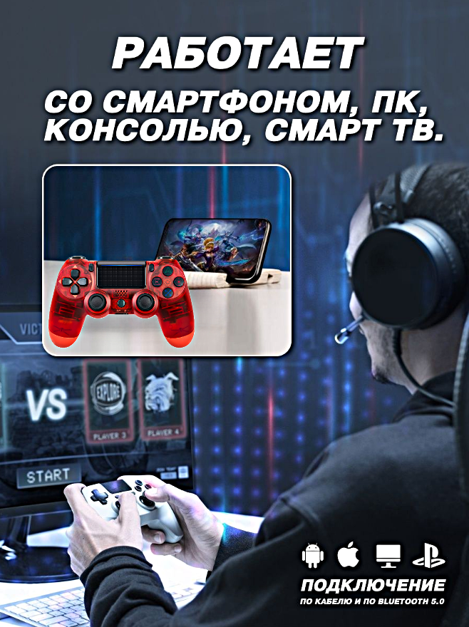 Геймпад беспроводной игровой джойстик для PlayStation 4, ПК, iOs, Android, Bluetooth, USB, WinStreak, Crystal Красный информация: