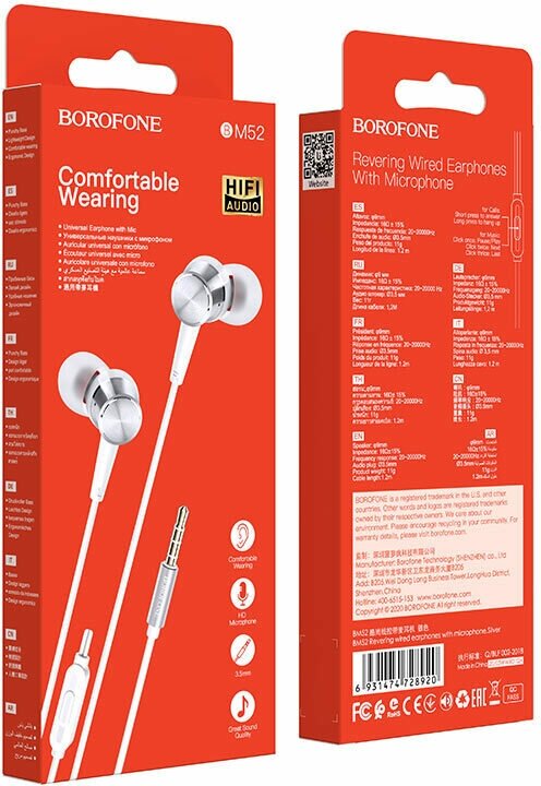 Наушники внутриканальные Borofone BM52, Revering wired, микрофон, кнопка ответа, регулятор громкости, цвет серебряный