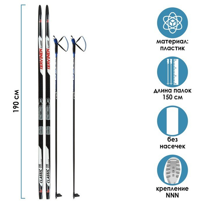 Комплект лыжный: пластиковые лыжи 190 см без насечек, стеклопластиковые палки 150 см, крепления NNN, цвета микс информация: