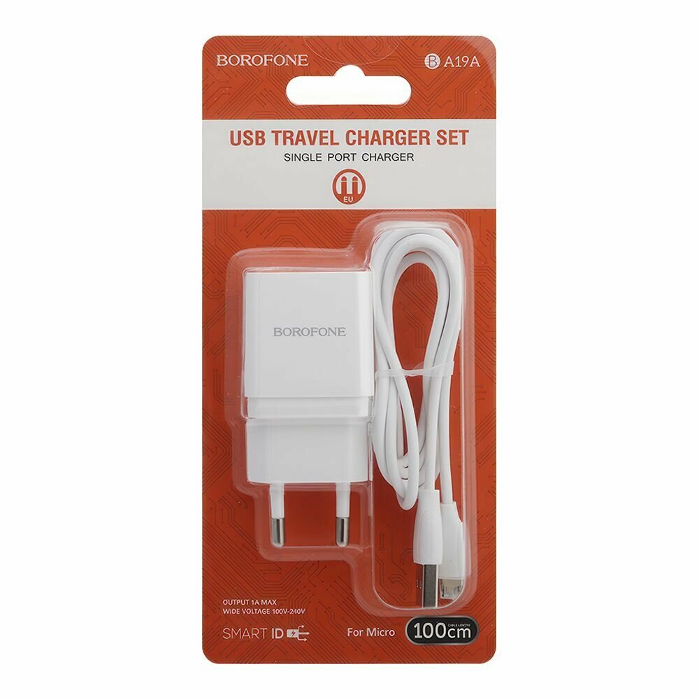 Зарядка для телефона BOROFONE BA19A Nimble 1xUSB, 1А + кабель MicroUSB, 1м (белый)